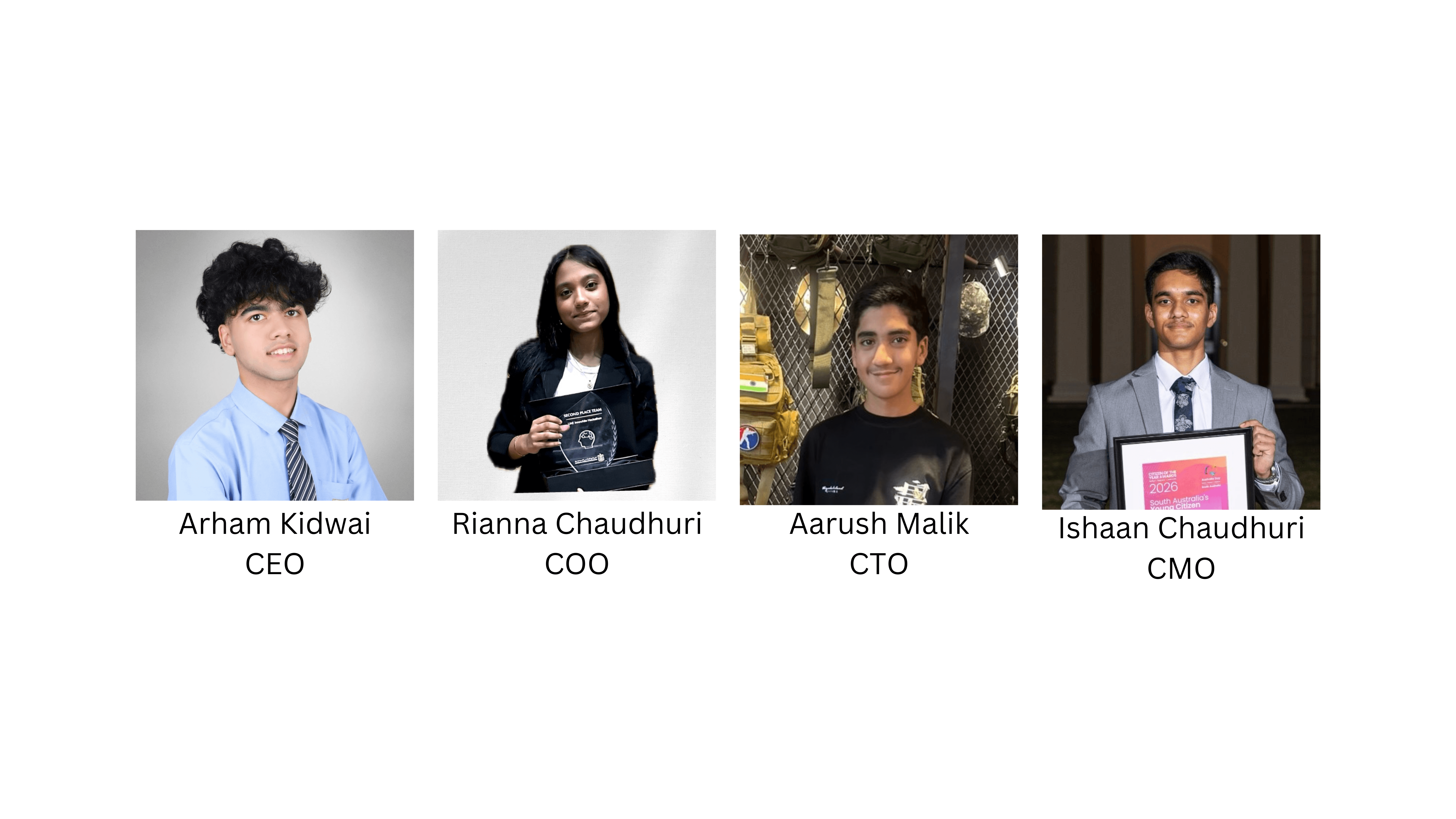 Meet the team behind ClimateShield, a group of driven young innovators committed to tackling climate challenges through technology and impactful solutions. Led by Arham Kidwai (CEO), alongside Rianna Chaudhuri (COO), Aarush Malik (CTO), and Ishaan Chaudhuri (CMO), the team combines leadership, creativity, and technical expertise to build a more sustainable and resilient future.